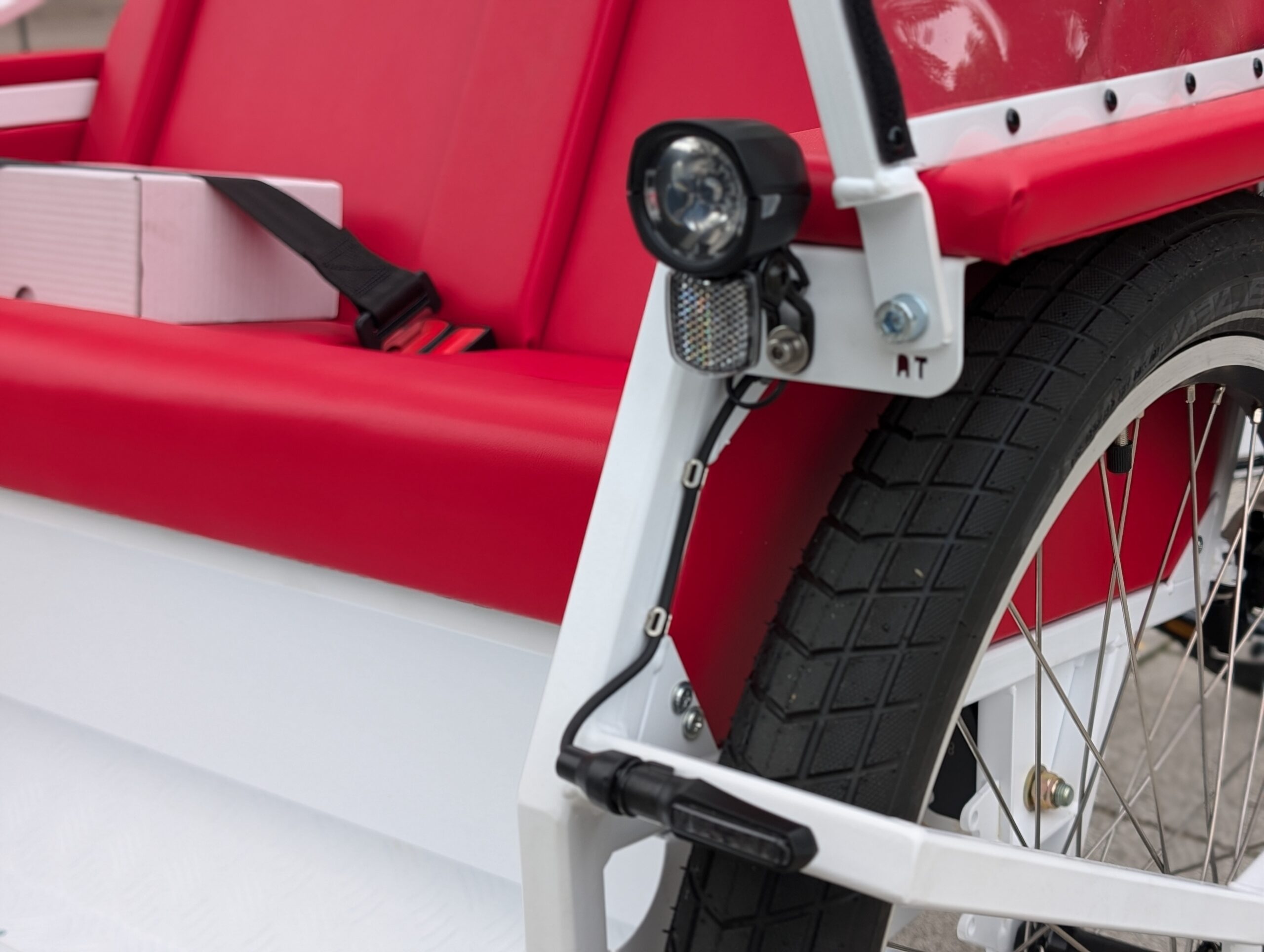 Für Illuminierung auf Abend- und Nachtfahrten sorgt die 5-fach Beleuchtung von BUSCH & MÜLLER, die über das Coolly® Cockpit-Display gesteuert wird. Zwei Frontleuchten vorne und drei Rückstrahler hinten. Mit smarter Einschaltautomatik bei dämmrigen Lichtverhältnissen, die auch in schlecht ausgeleuchteten Unterführungen selbständig angeht. In Kombination mit den beidseitigen Rückspiegeln von BUSCH & MÜLLER ist der Verkehr bei allen Lichtverhältnissen sicher im Blick. Eine Gurtpflicht gibt es für Fahrräder nicht, dennoch wurde ein 2-Punkt Gurtsystem (wie im Auto) verbaut. Optional als Zusatzausstattung sorgt das 4-fach Blinkersystem (2x vorne, 2x hinten) für eine zusätzliche Indikation beim Abbiegen und macht das Handzeichen überflüssig. Die Innenraumbeleuchtung (Zusatzausstatung AS10) sorgt optional für ein angenehmes Ambient-Licht auf Abend- und Nachtfahrten und kann über das USB am Coolly® Cockpit-Display aktiviert werden.