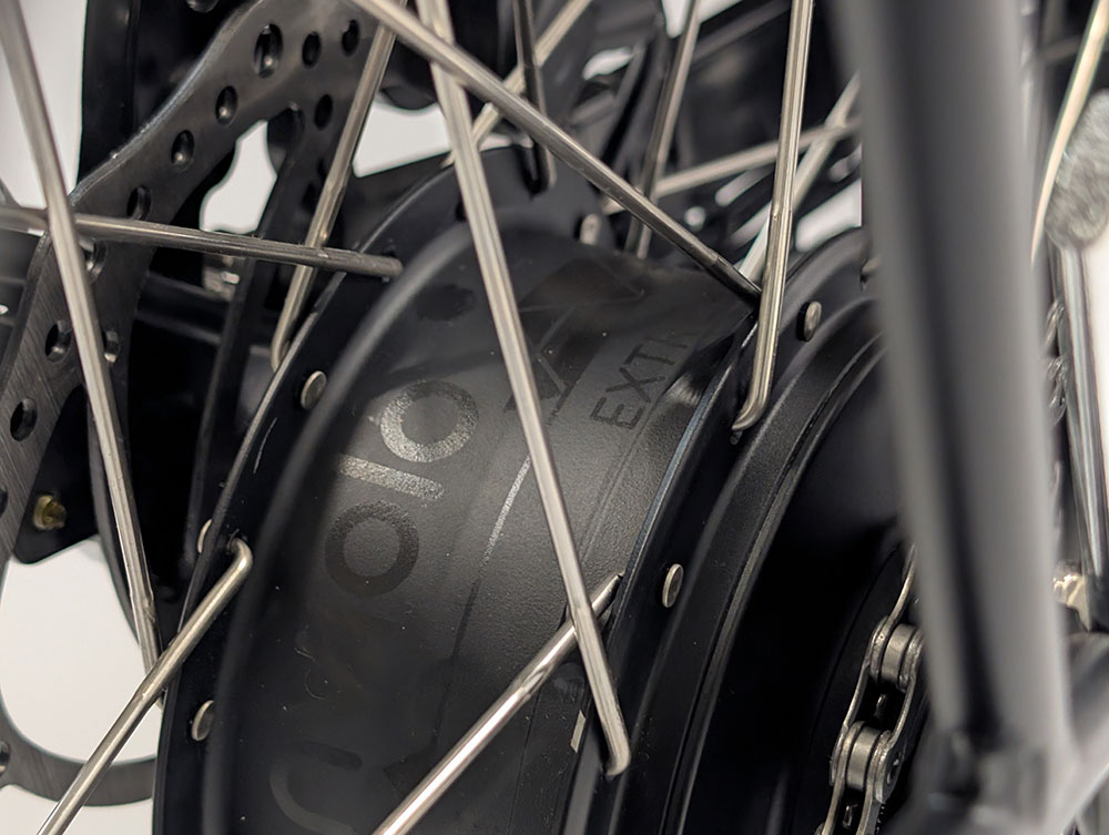 Die Premium-Laufräder von Coolly® bilden das Zentrum der Mechanik. Sie tragen die Lasten und werden von Hand in unserer Manufaktur mit mehr als 15 Jahren Erfahrung gebaut und zentriert. Mit den außerordentlich robusten 26-Zoll-Felgen von RYDE und den Dickendspeichen von SAPIM bewältigen sie hohe Kraftwirkungen im leichten und schweren Terrain (Wald- und Schotterstraßen) ohne Probleme und ohne Speichenrisse. Hinzu kommt seit 2026 das neue Herzstück: die von Coolly® Bikeparts in München entwickelte und hergestellte Premium-Laufradnabe "Ultra", konzipiert für ultraschwere Lasten. In Kombination mit der Bereifung von SCHWALBE ergibt sich ein sportlich gefedertes Fahrerlebnis. Der bullige Reifen "Super Moto-X" für vorne und der "Pick-Up" für hinten bieten beste Fahreigenschaften. Mit enormer Breite, riesigem Volumen, Stabilität und Grip bieten sie eine hohe Traglast von 140 bis 150 kg pro Reifen und meistern Unebenheiten bei gleichzeitig hoher Laufruhe mit Leichtigkeit.